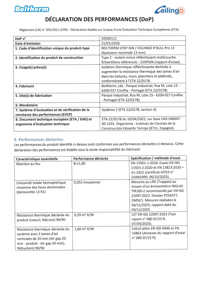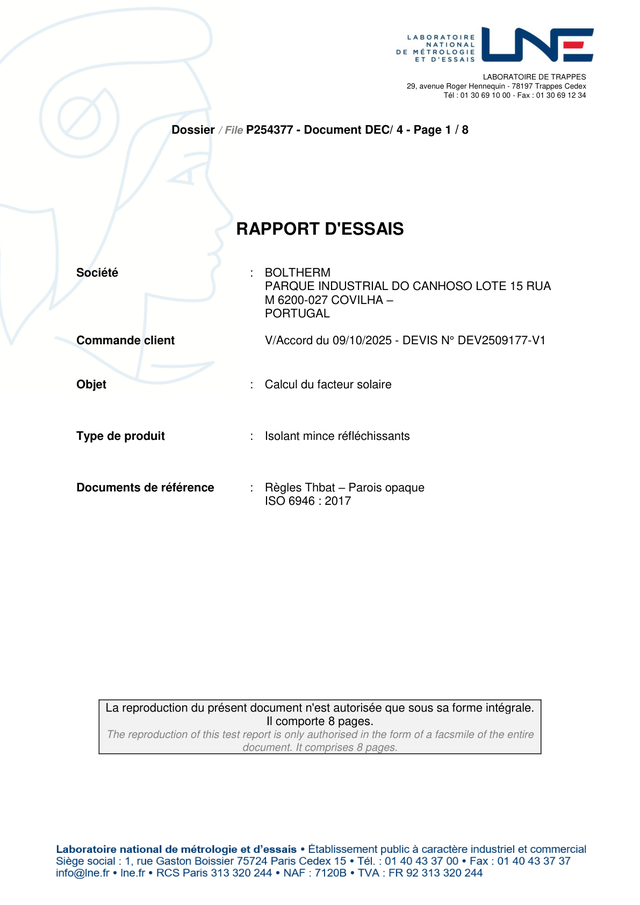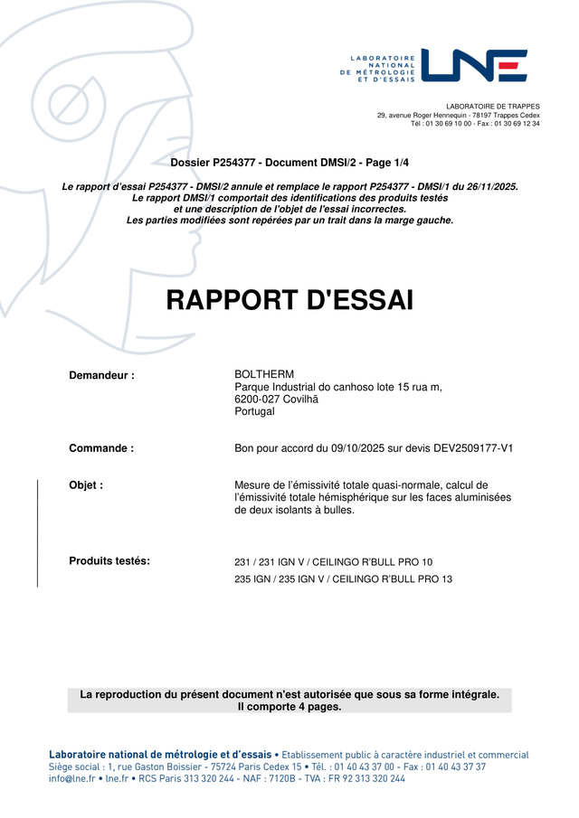 Réaction au feu, DoP, essais (emissivité et facteur solaire), rapport de résistance thermique, fiche produit.