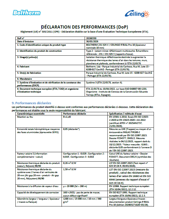 Réaction au feu, DoP, essais (emissivité et facteur solaire), rapport de résistance thermique, fiche produit.